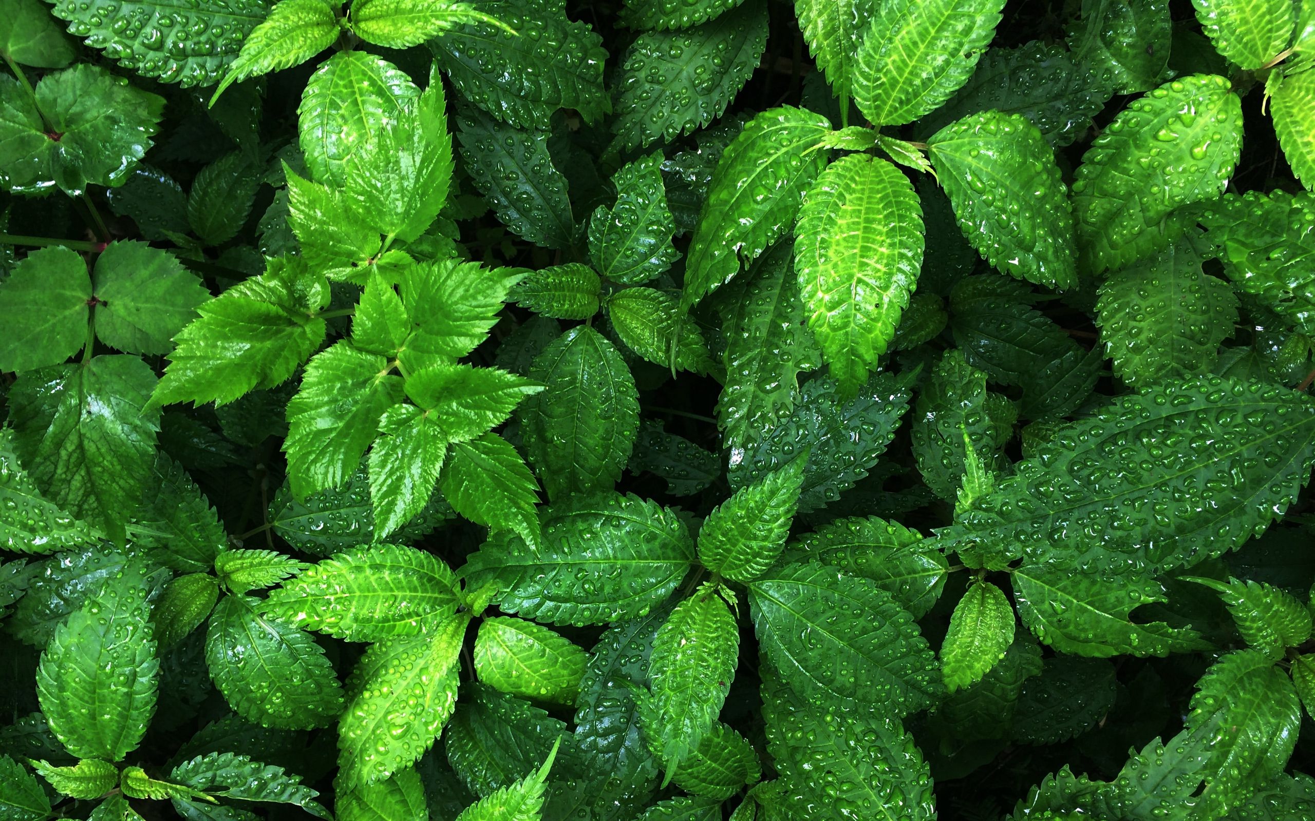 Description: A close up of a bunch of green leaves with water droplets on them.