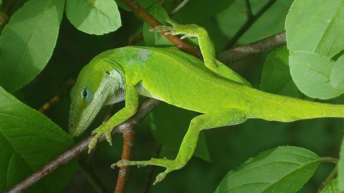 Description: A green lizard is sitting on a branch in a tree with leaves and a bush in the background.