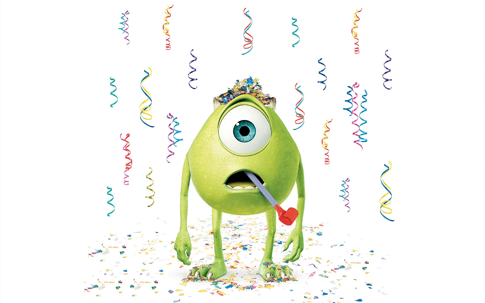 Description: A green monster with a toothbrush in his mouth surrounded by confetti and streamers of streamers.