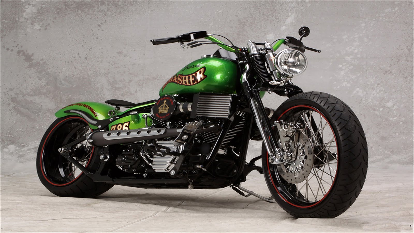 Description: A green motorcycle parked in a room with a cement wall behind it and a red rim around the tire.