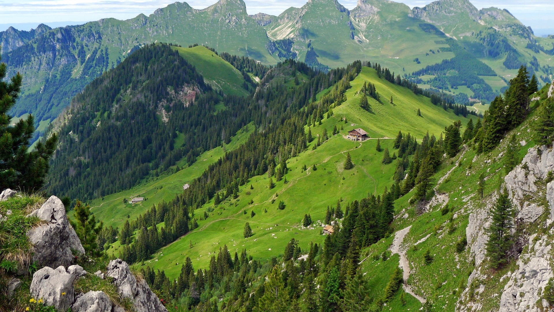 Description: A green mountain with a house on the top of it and trees on the side of it and mountains in the background.