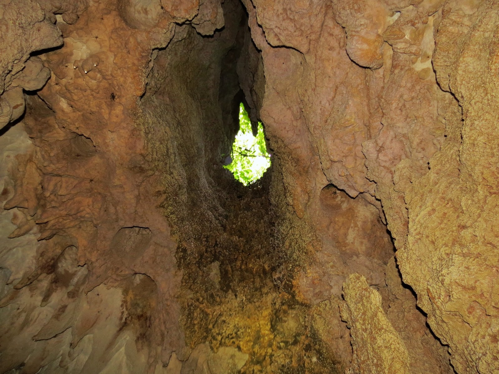 Description: A green object is in a cave with rocks and dirt on the ground and a light in the middle of the cave.