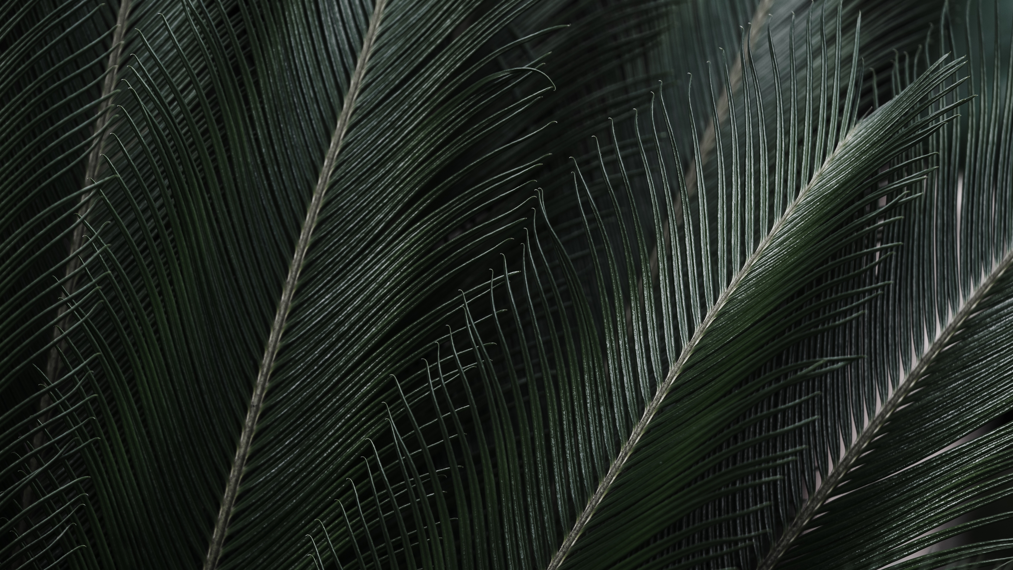 Description: A close up of a green palm tree leaf with a black background and a white bird in the center.