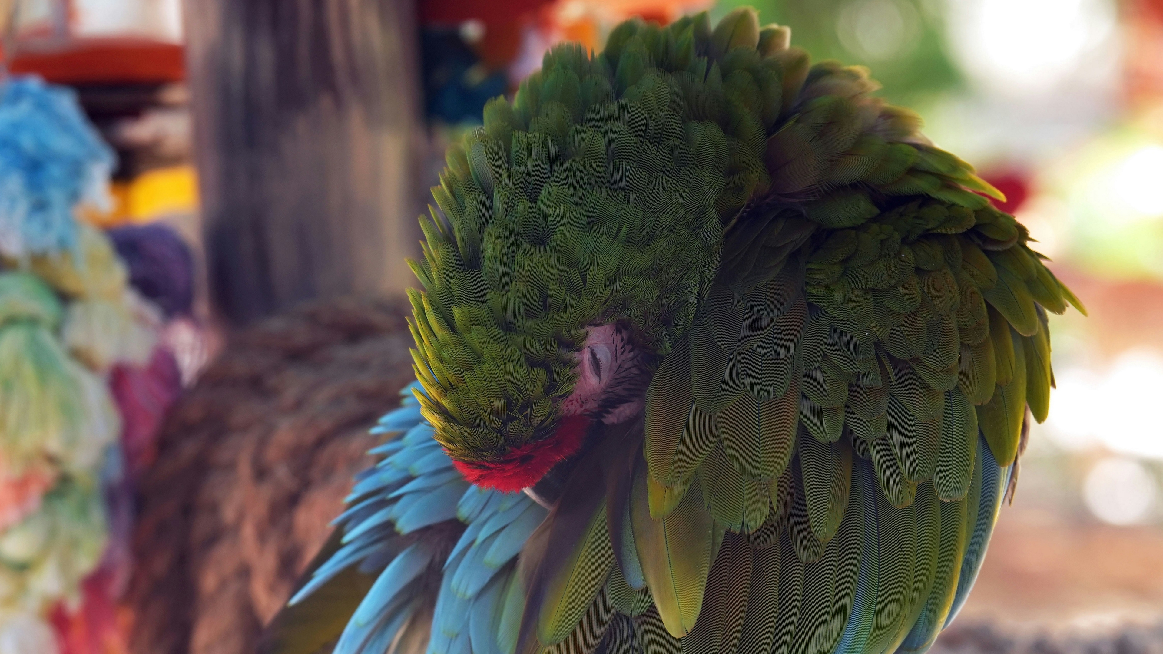 Description: A green parrot with a red head and blue wings sitting on a tree branch in a store display area.