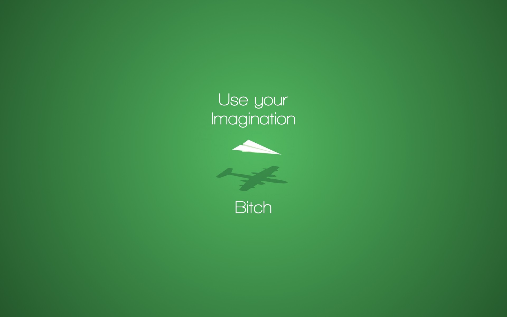 Description: A green background with a plane flying in the sky and the words use your imagination birch on it's side.
