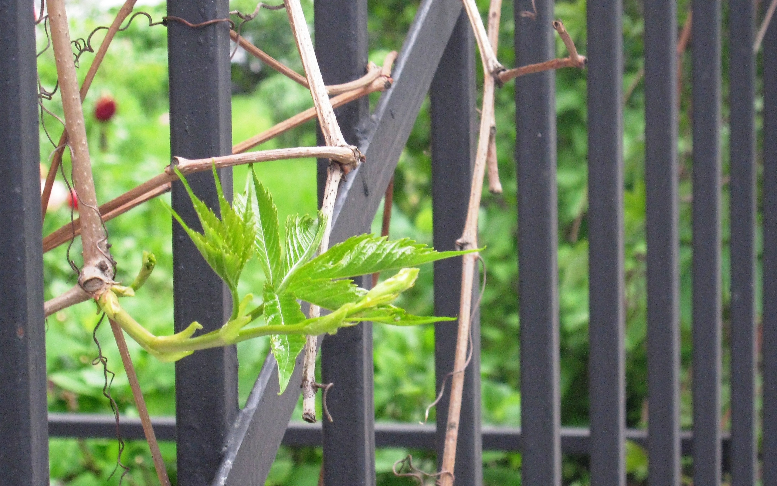 Description: A green plant growing through a metal fence in a garden area with a green bush behind it and a black fence.
