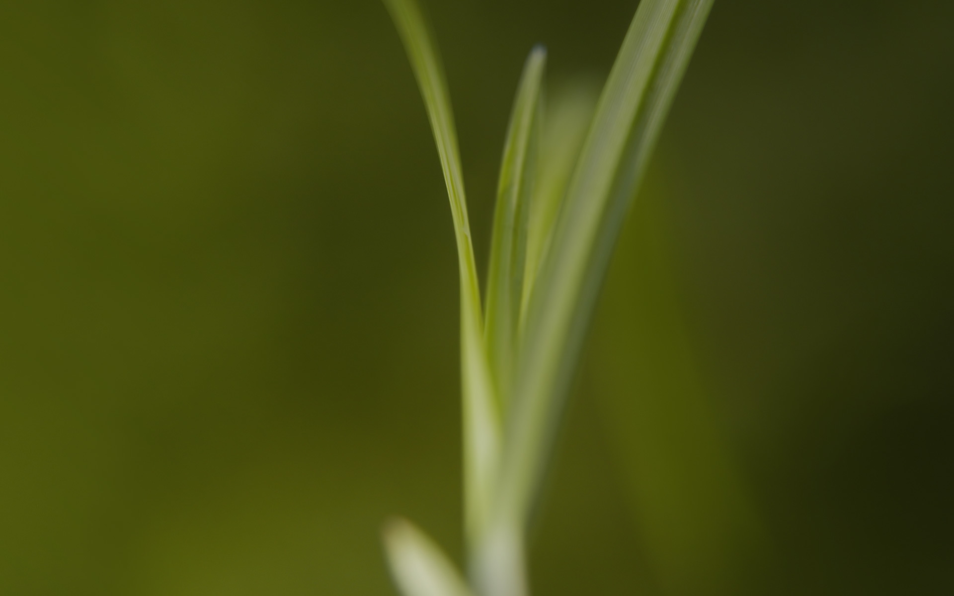 Description: A close up of a green plant with a blurry background of grass and leaves in the foreground.