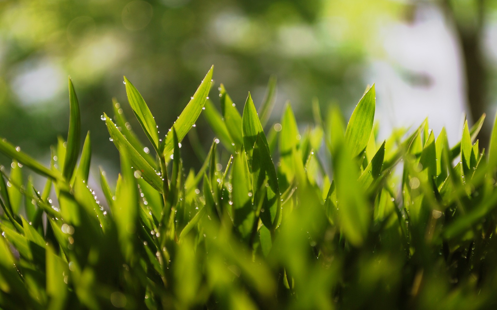 Description: A close up of a green plant with water droplets on it's leaves and grass in the foreground.