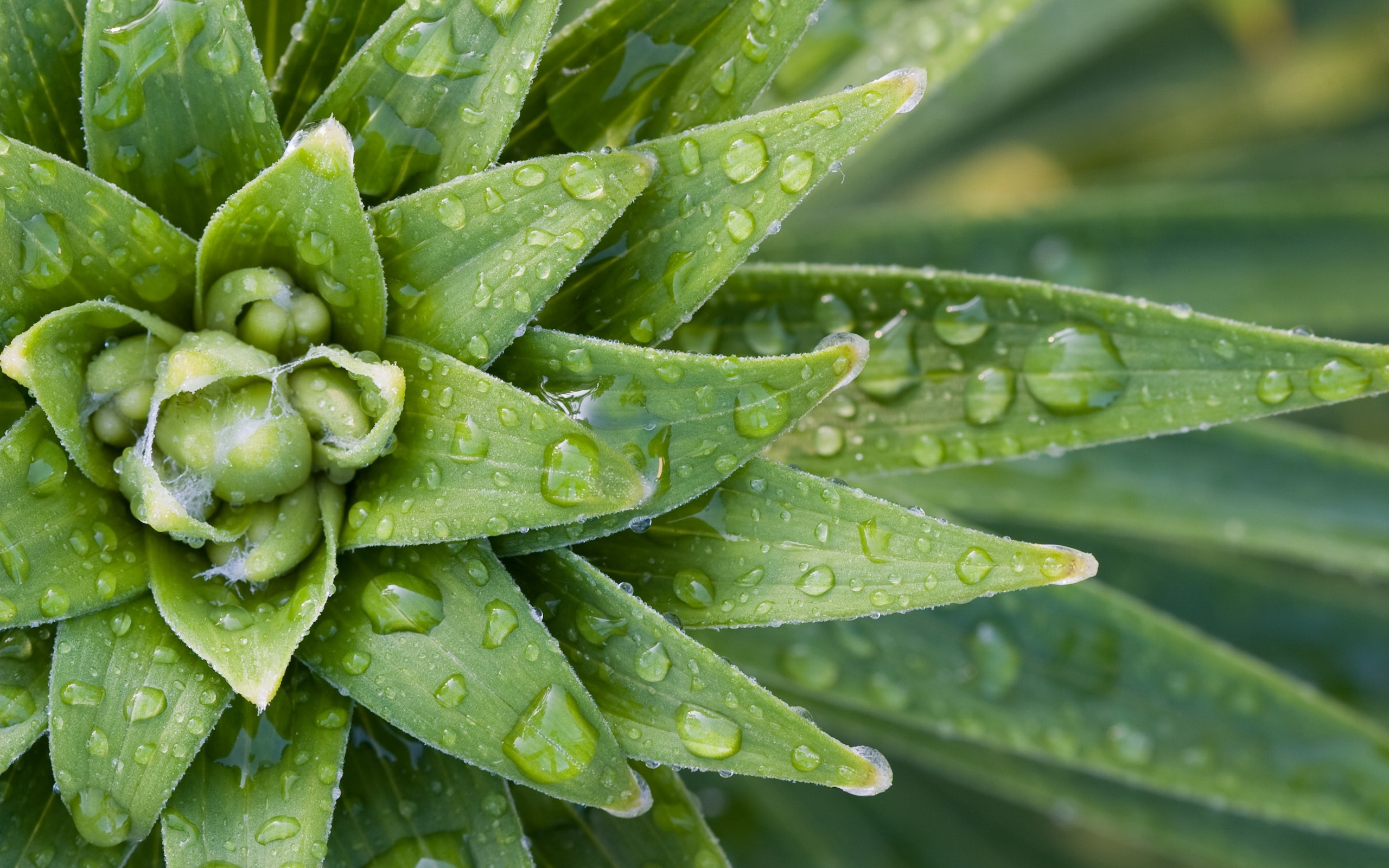 Description: A close up of a green plant with water drops on it's leaves and leaves around it's center.