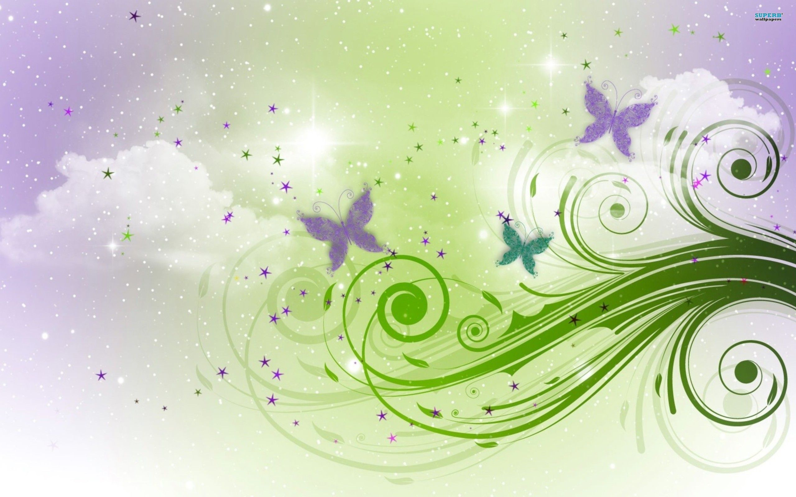 Description: A green and purple background with butterflies and swirls on it.