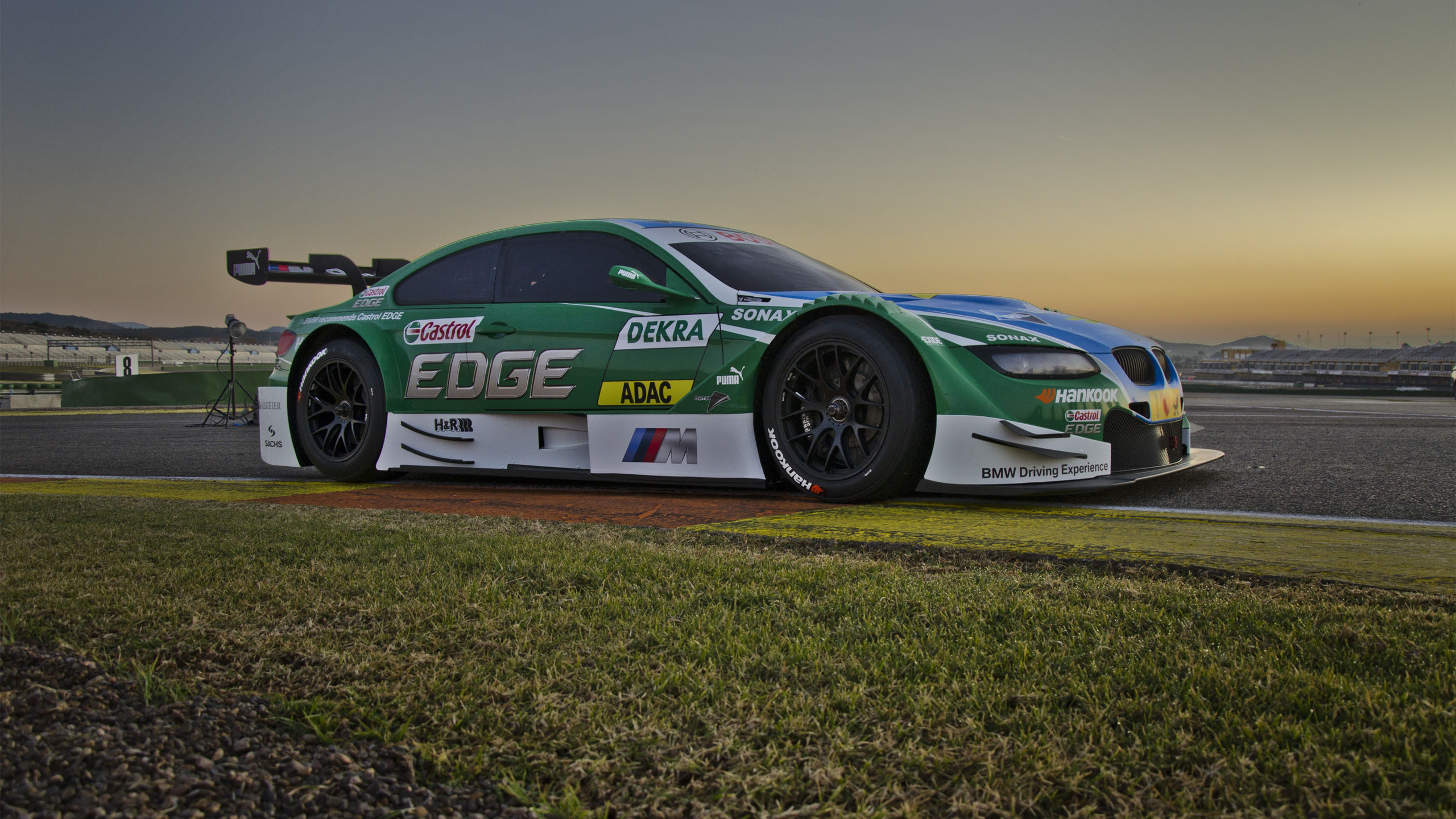 Description: A green race car driving down a race track at sunset or dawn with a sky background and grass and grass area.