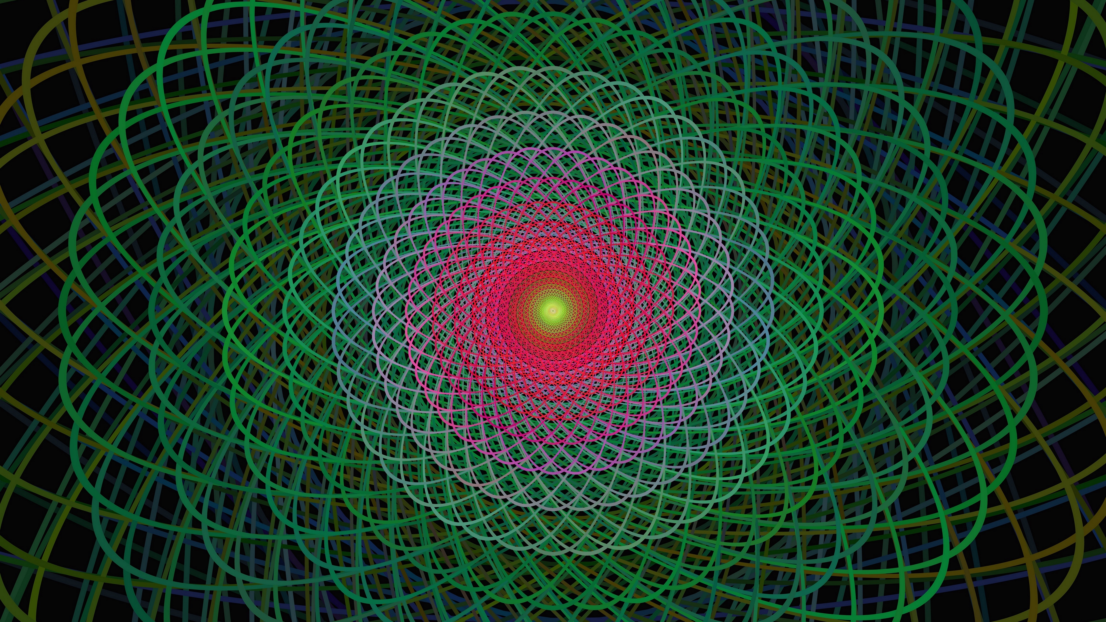 Description: A computer generated image of a green and red spiral design on a black background with a green center and yellow center.