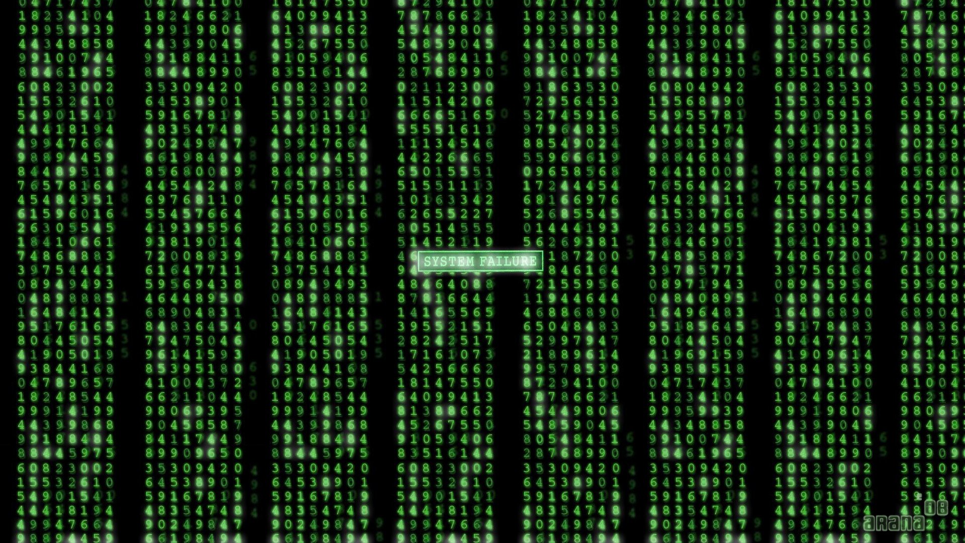 Description: A green sign is in front of a wall of green numbers and numbers on a black background with a green arrow.