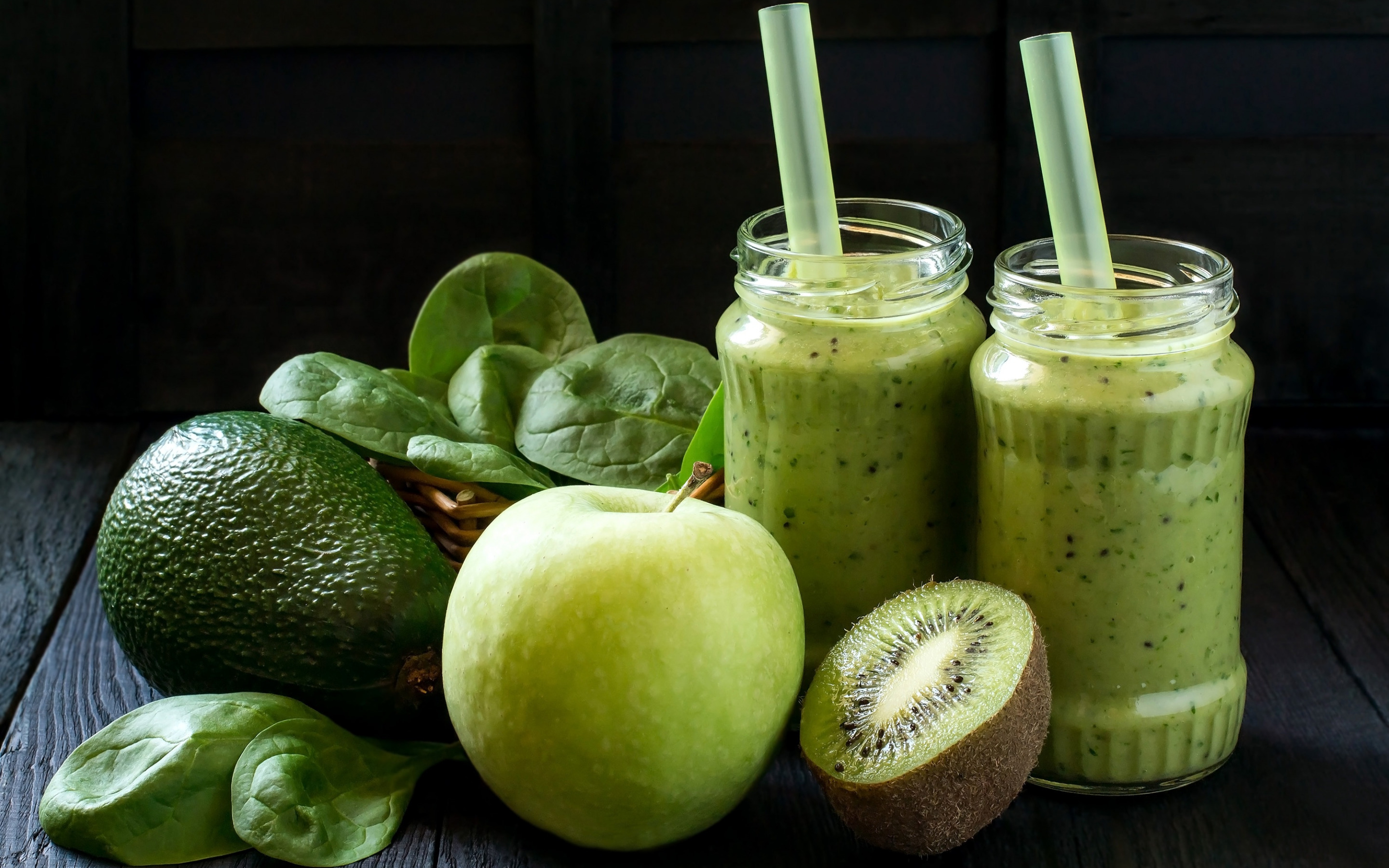 Description: A couple of glasses of green smoothie next to some fruit and vegetables on a table with a knife.