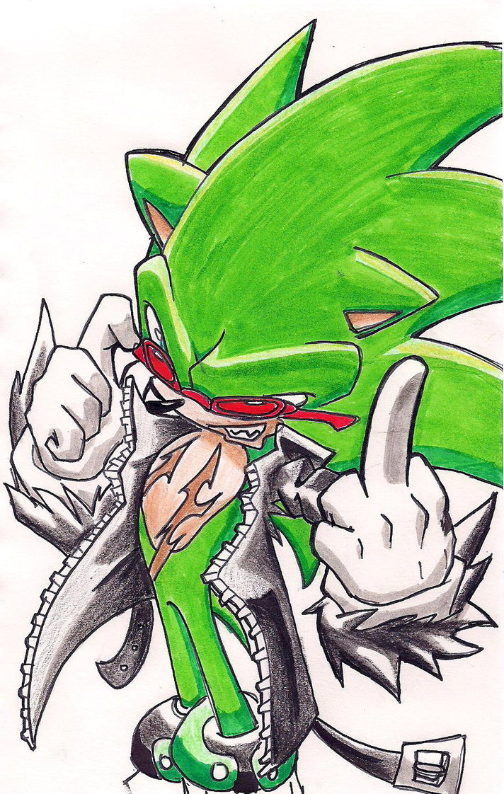Description: A drawing of a green sonic the hedge character with a green hat and a green jacket and a black and white shirt.