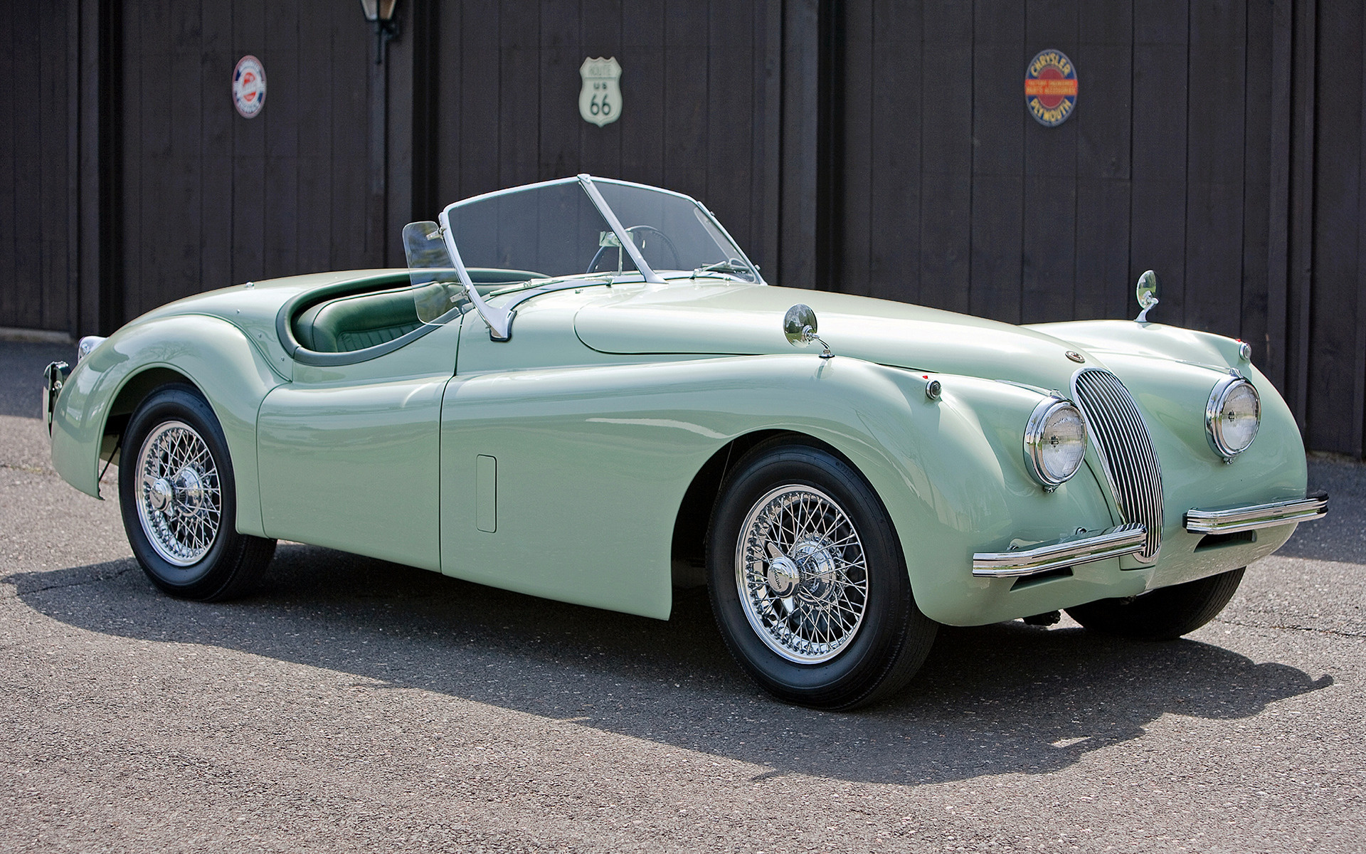 Description: A green sports car parked in front of a building with a black wall behind it and a black door.
