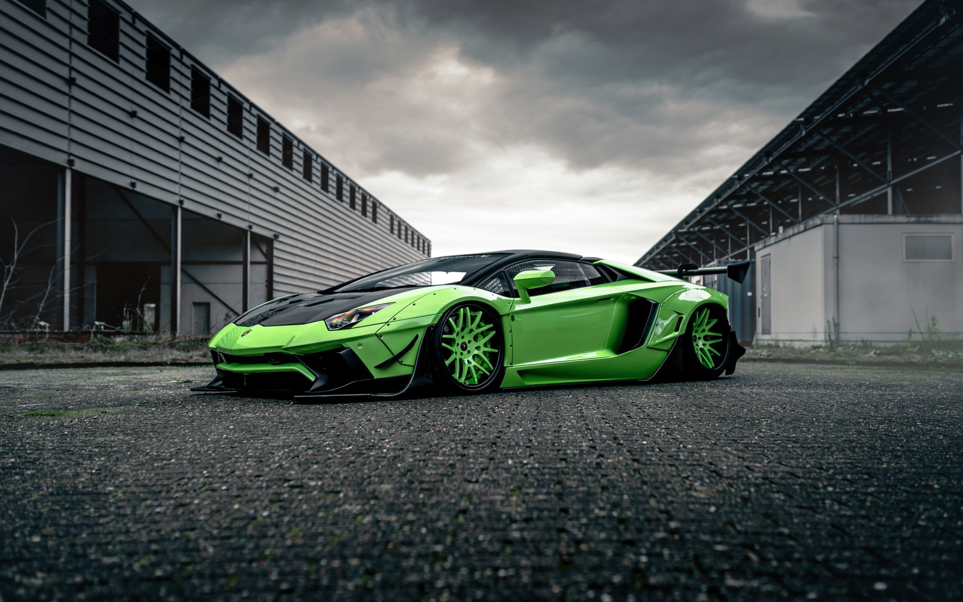 Description: A green sports car parked in front of a building on a cloudy day with dark clouds in the background.