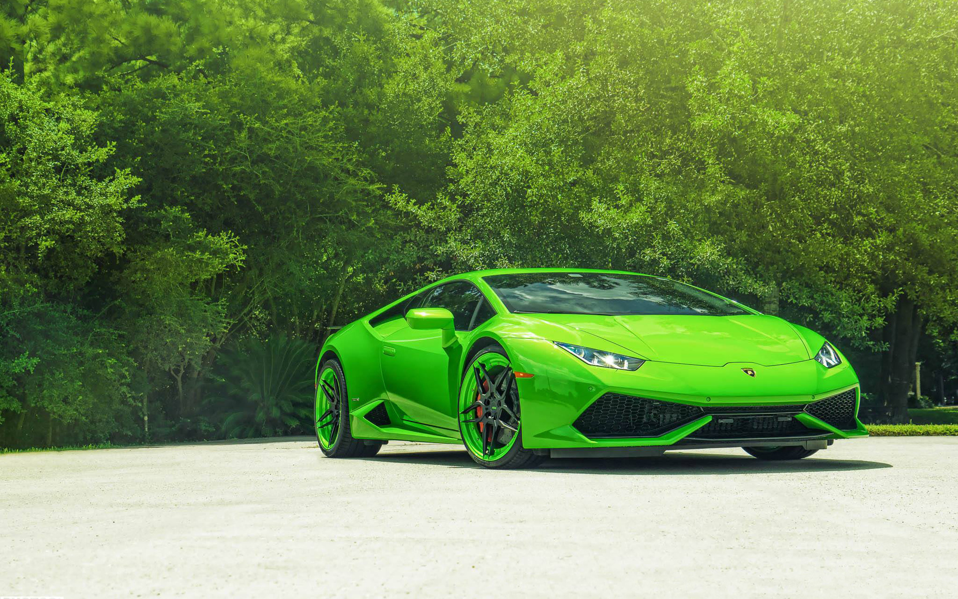 Description: A green sports car parked in front of a forest of trees and bushes in a parking lot with a green car in the background.