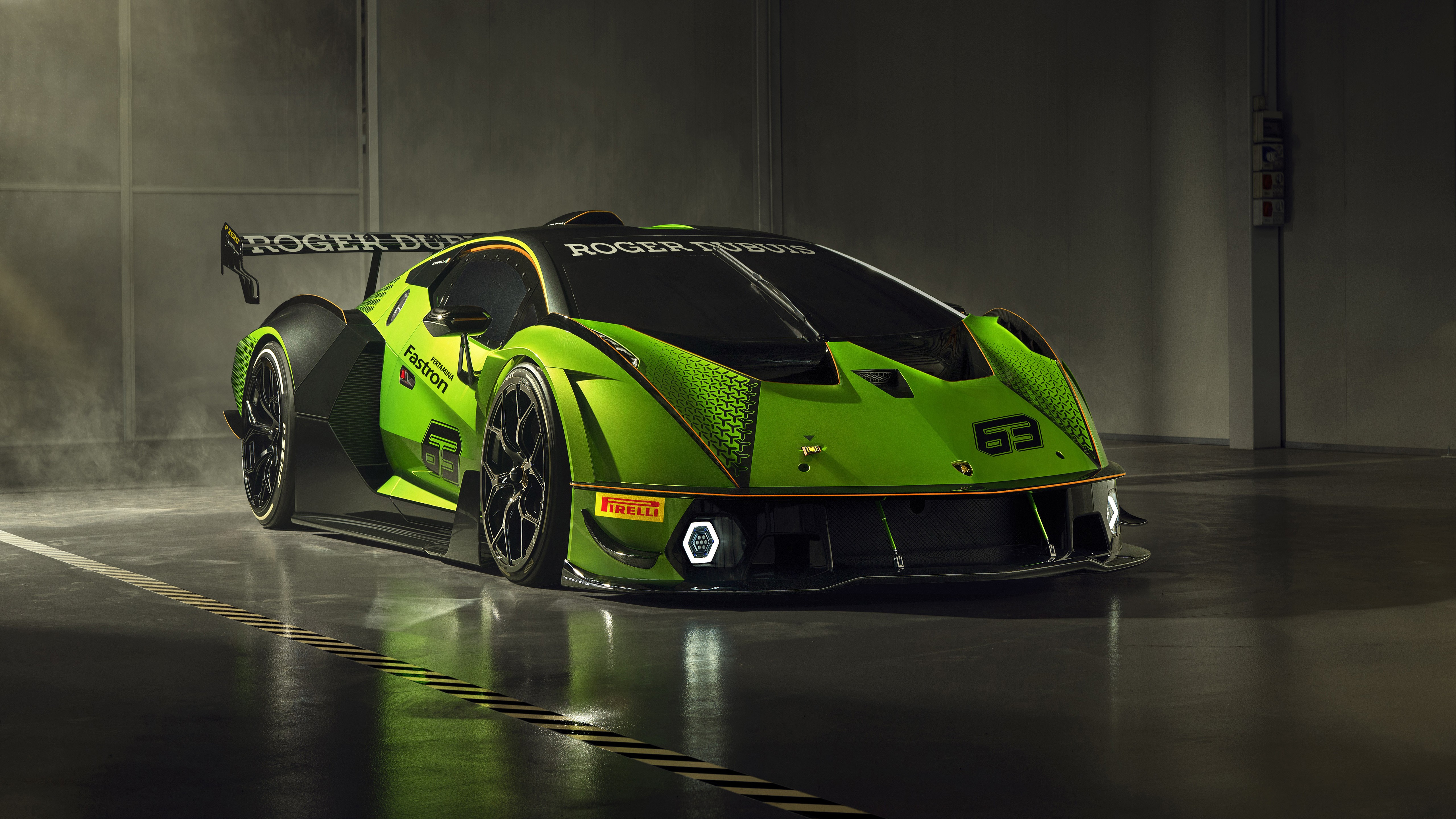 Description: A green sports car parked in a garage with fog coming from the ceiling and a light shining on the car.