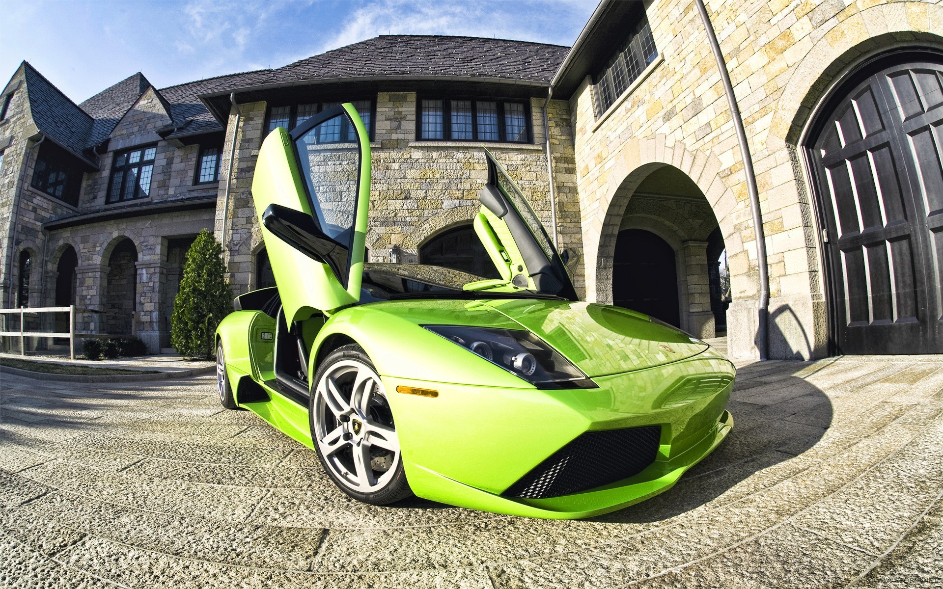 Description: A green sports car parked in front of a house with a large door open to the outside of it.