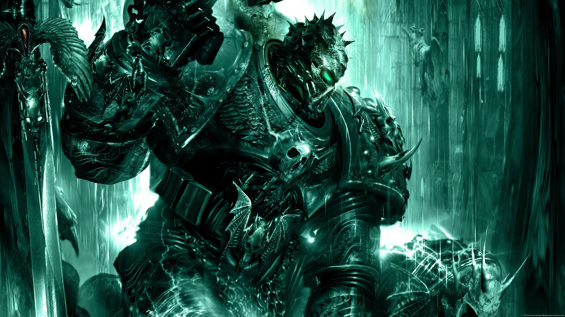 Description: A man in a green suit holding a sword in a dark forest with a demon on his arm and a demon on his shoulder.