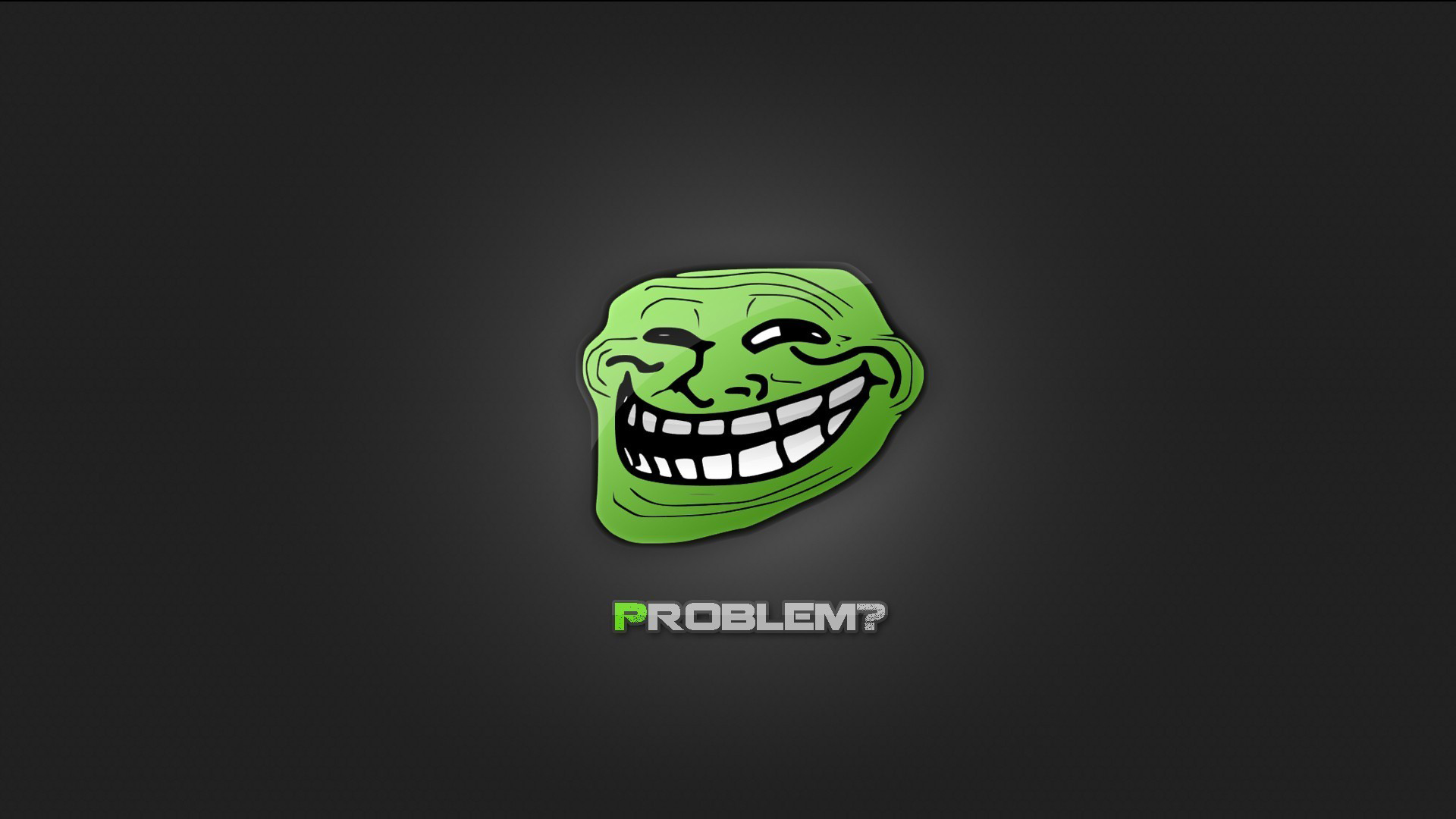 Description: A green troll face with a smile on it's face and the word problem written below it in a black background.