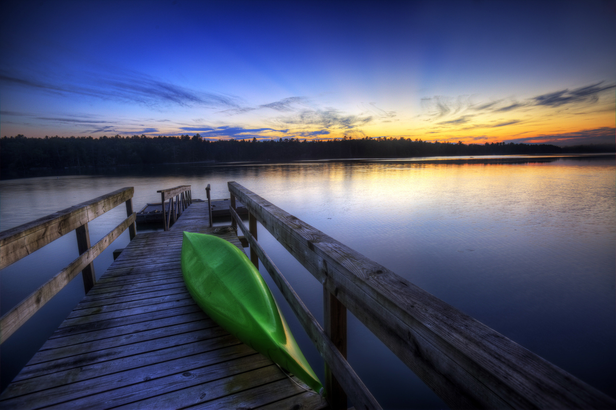 Description: A green umbrella sitting on a wooden dock next to a body of water at sunset or dawn with a boat in the water.