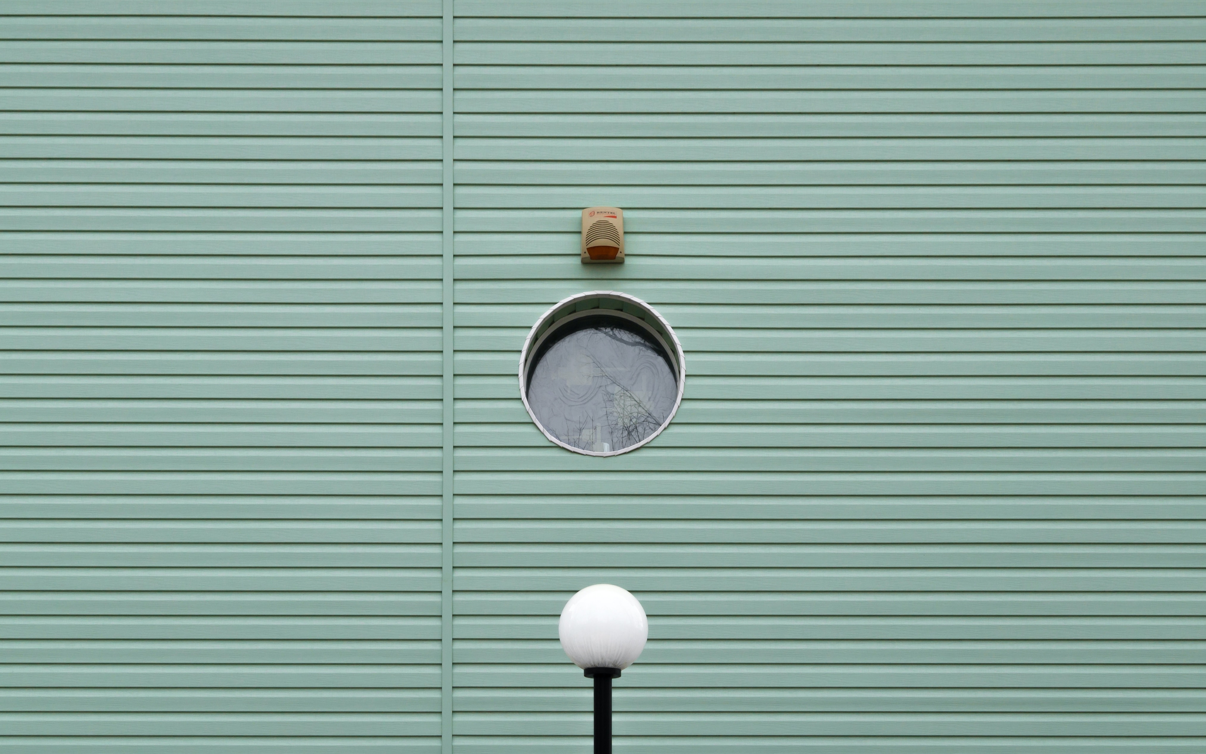Description: A round window on a green wall with a light pole in front of it and a round window on the side of the building.