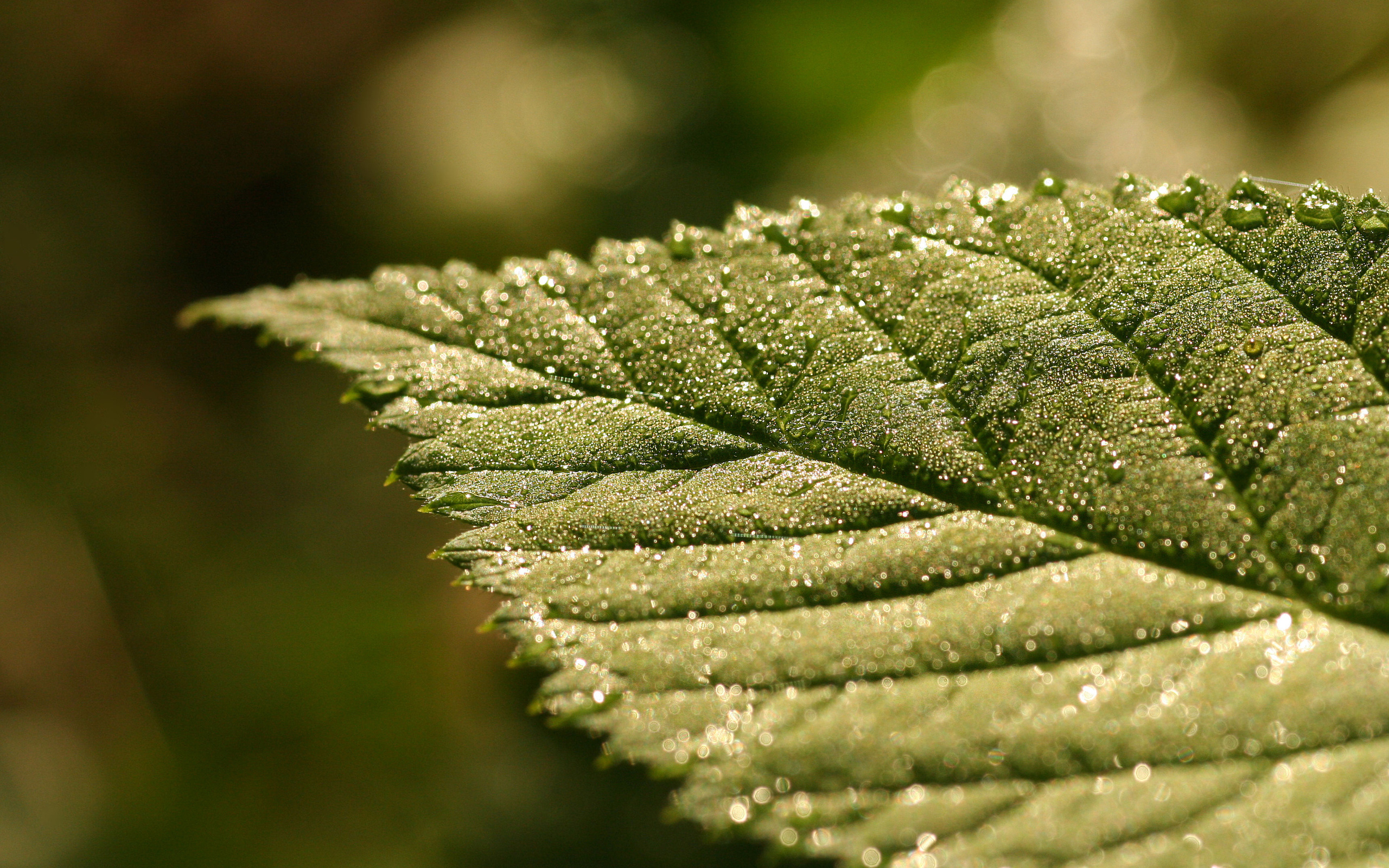 Description: A close up of a leaf with water droplets on it's leaves are green and shiny in the sunlight.