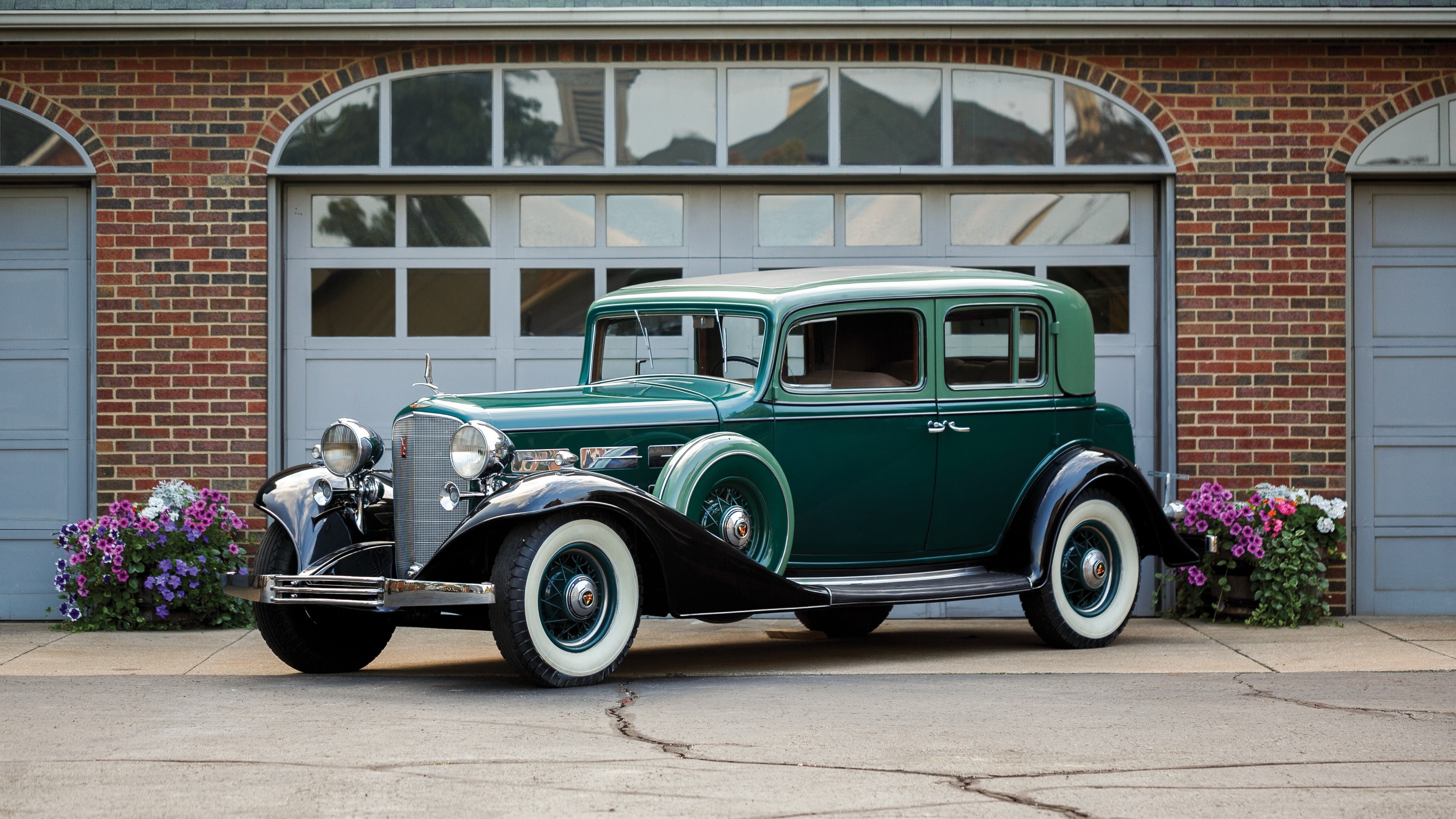 Description: A green and white car parked in front of a garage door with flowers in front of it and a brick building.