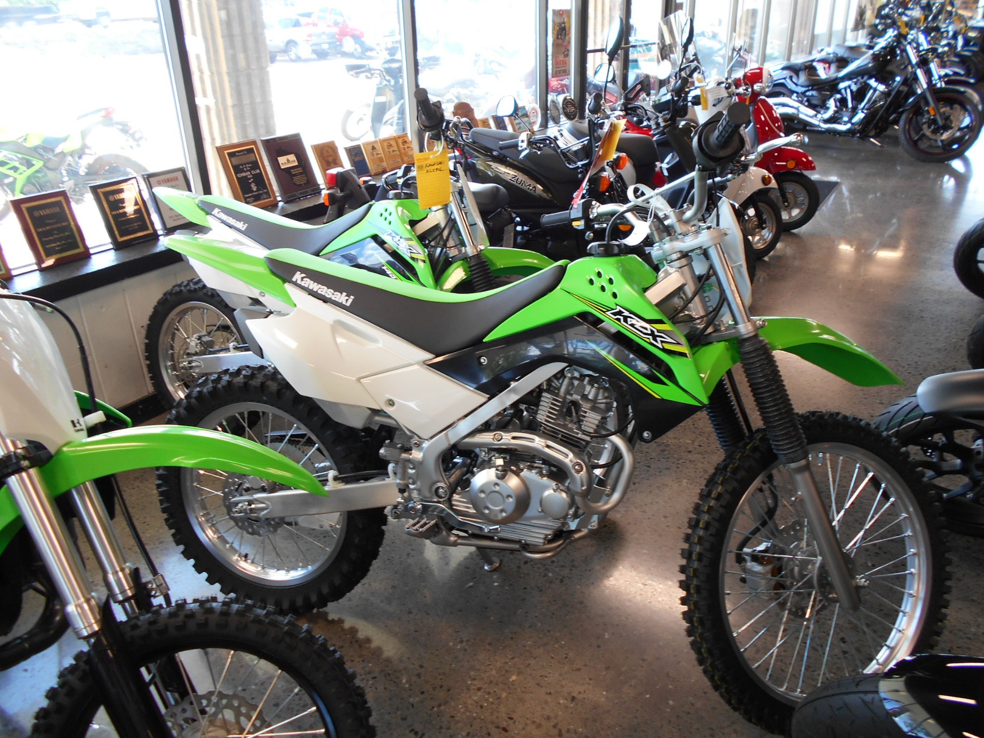 Description: A green and white dirt bike parked inside of a building next to other motorcycles and motorcycles on display in a building.