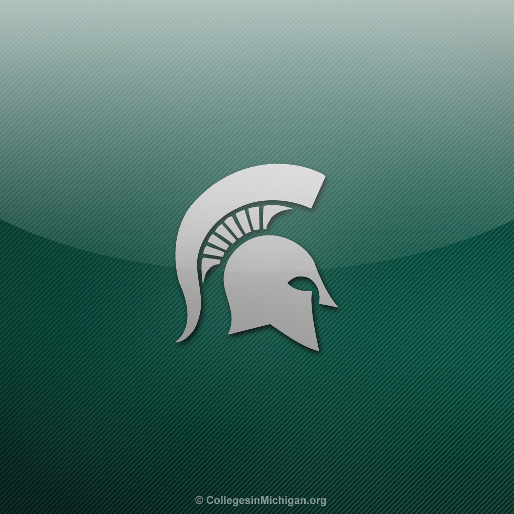 Description: A green and white spartan logo on a green background with a white spartan helmet on it's side.