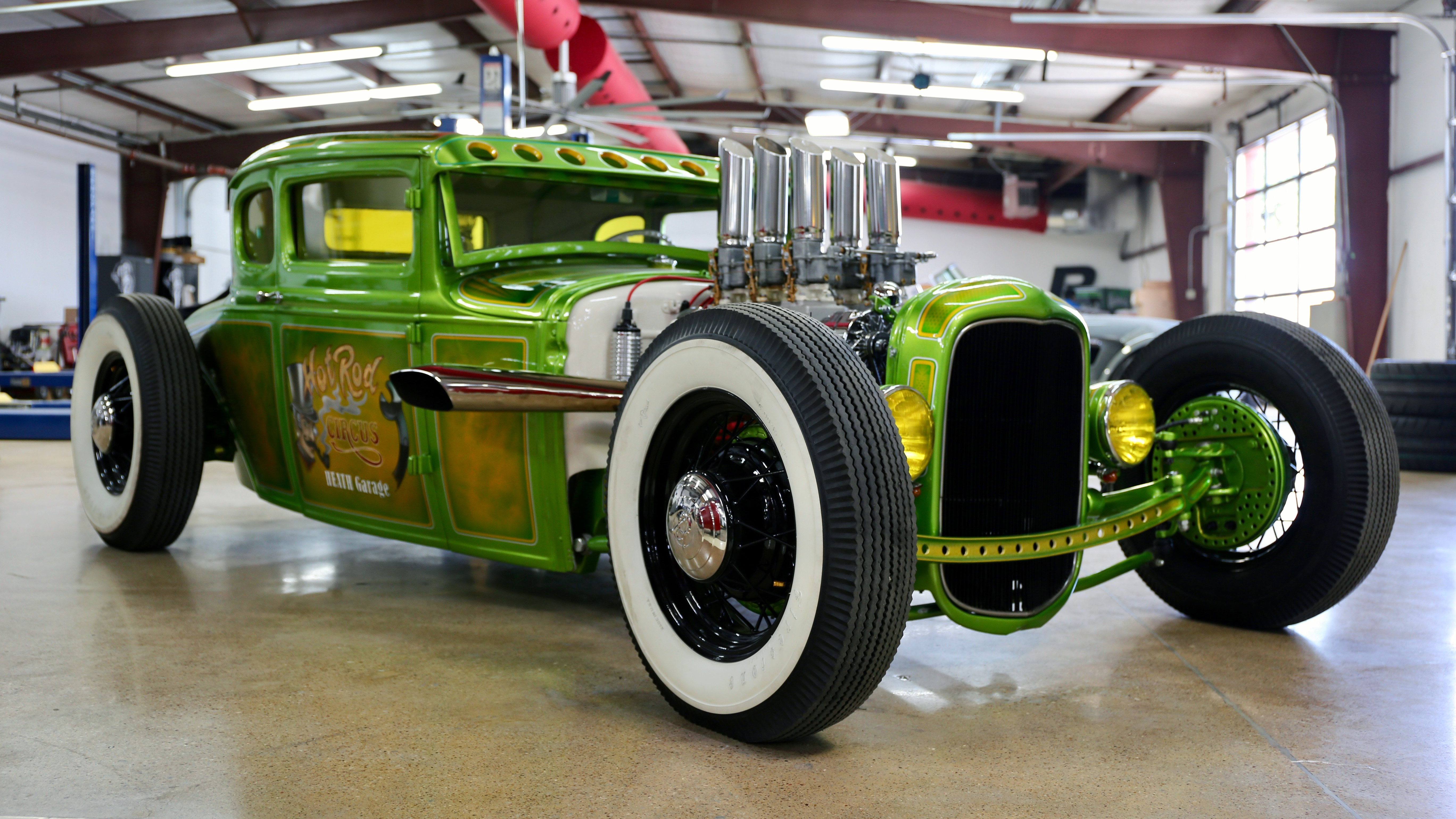 Description: A green and white truck in a garage with a yellow stripe around the front tire and a white rim.