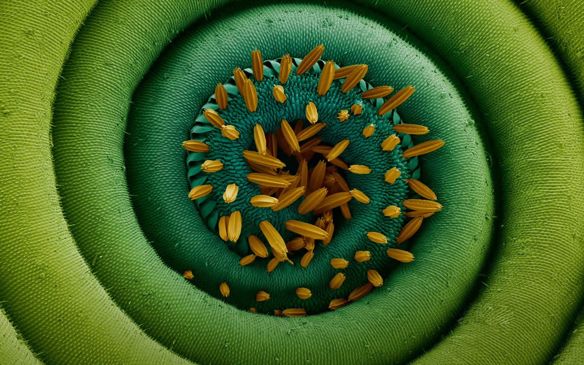 Description: A green and yellow object with a circular design in the center of it's center piece.