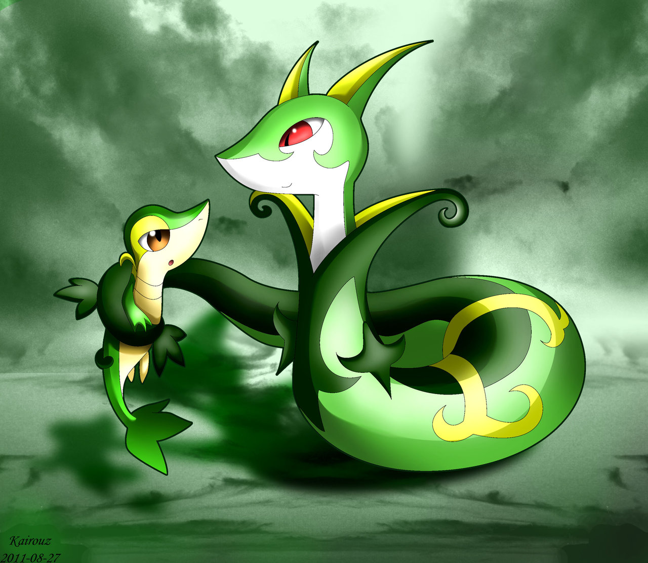 Description: A green and yellow snake and a yellow snake on a cloudy day with a dark sky in the background.