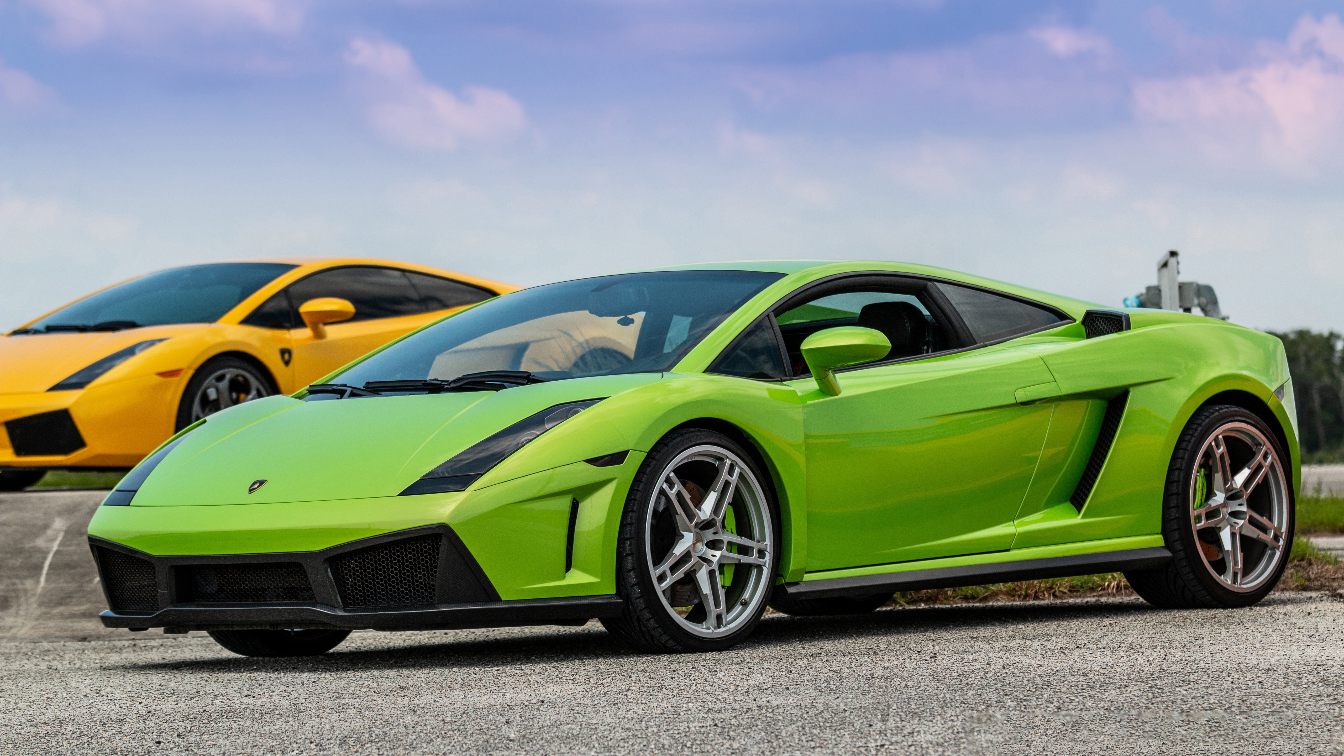 Description: A green and a yellow sports car parked in a parking lot together on a cloudy day with a blue sky.