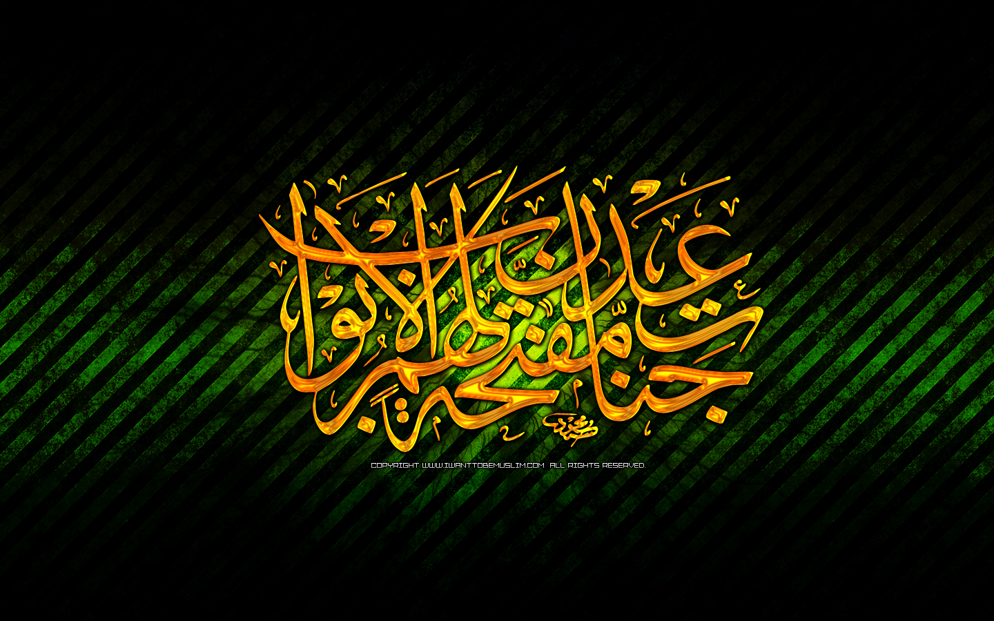 Description: A green and yellow wallpaper with a picture of a islamic calligraphy in the middle of it.