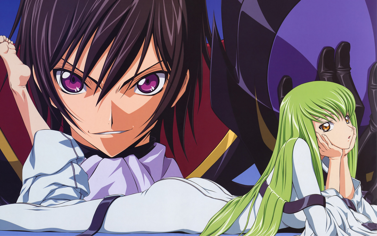 Description: A couple of anime characters laying on top of a bed together in front of a purple background with a green haired girl.