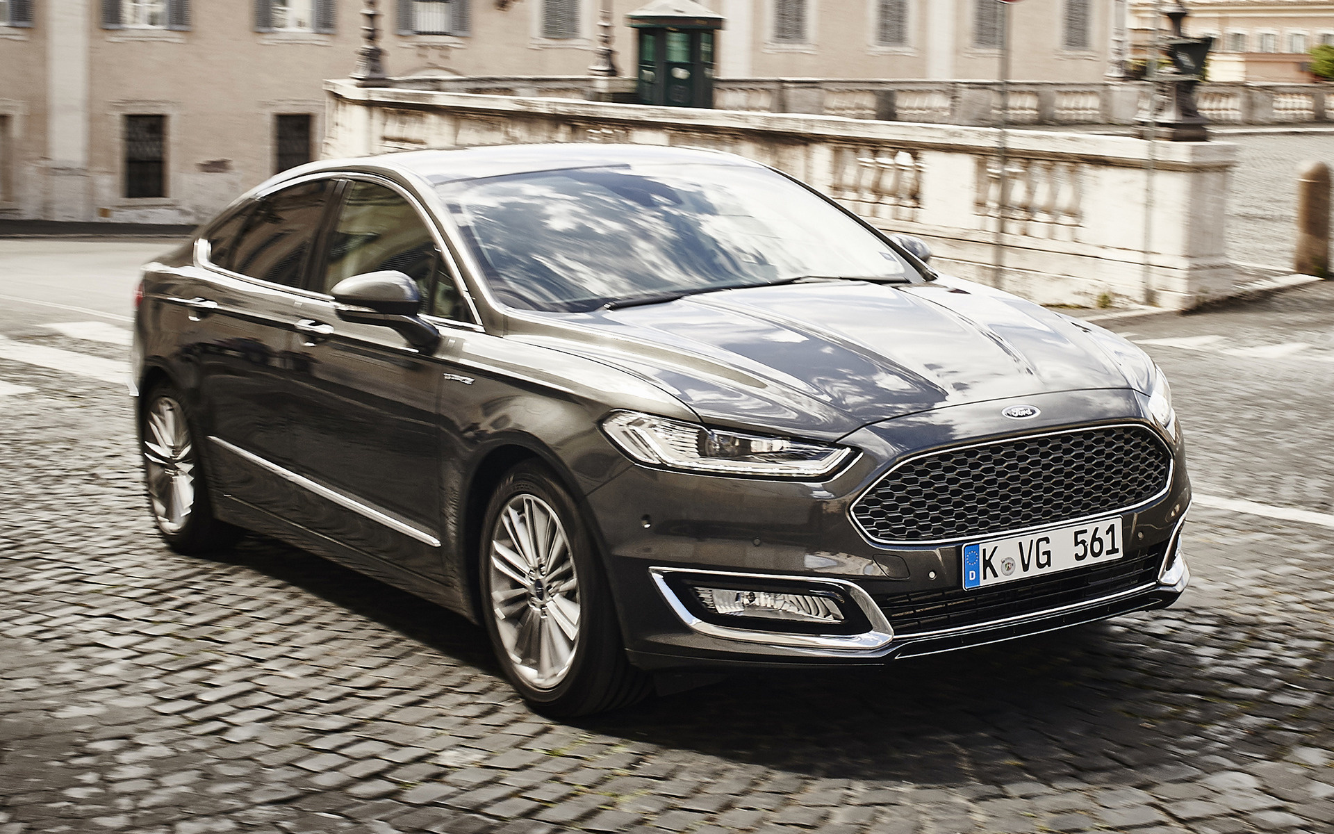 Description: A grey car driving down a cobblestone street next to a building with a clock on it's front.