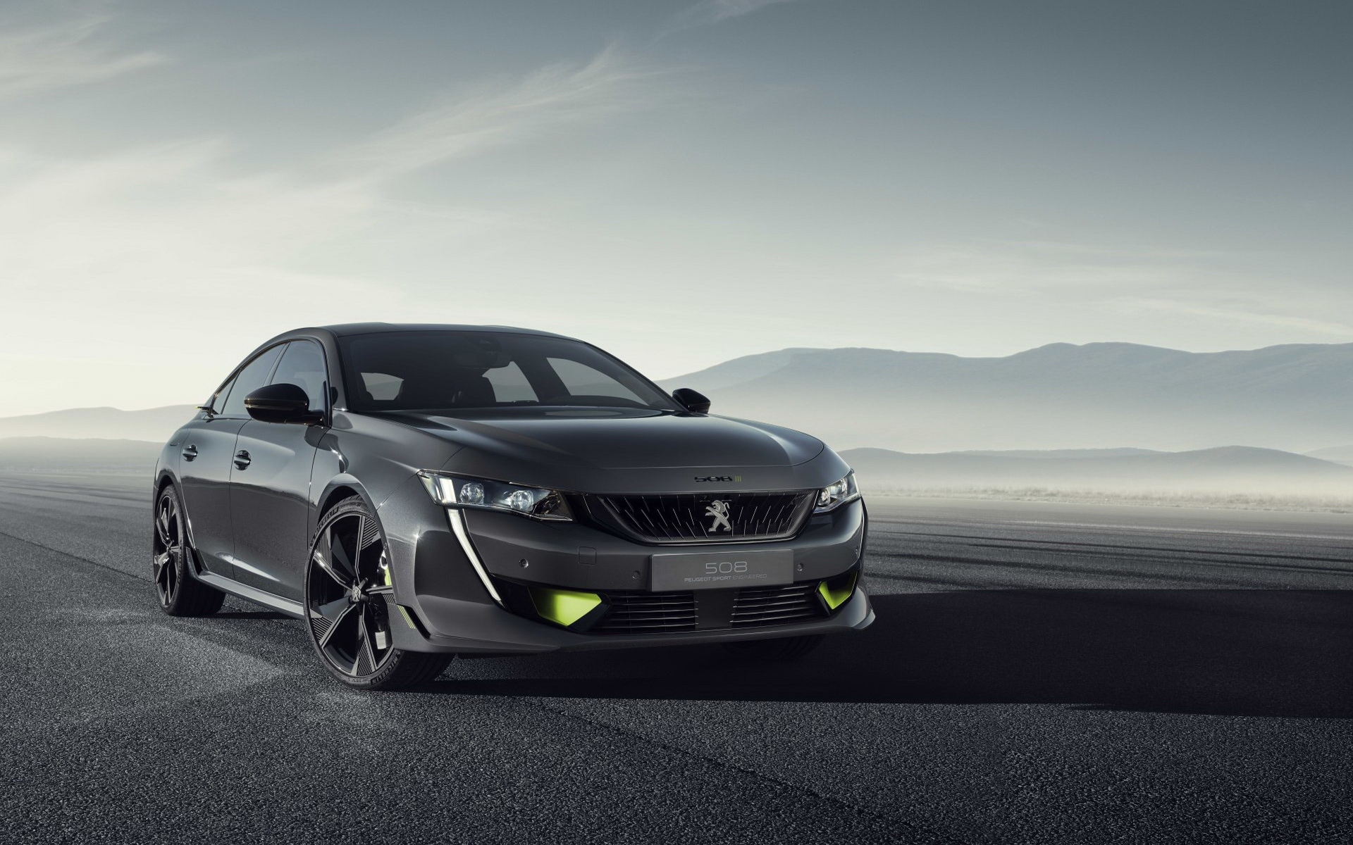 Description: A grey car driving down a road with mountains in the background and a sky background with clouds in the distance.