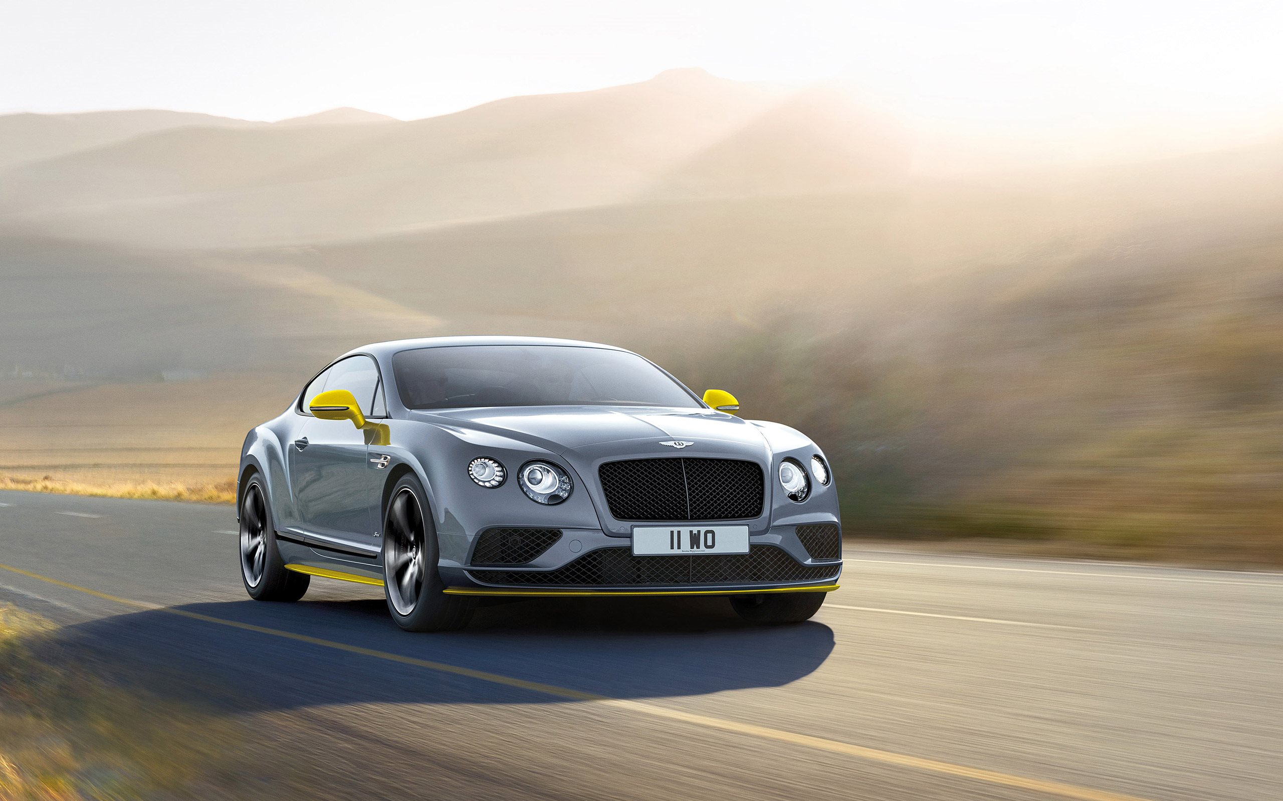 Description: A grey car driving down a road with mountains in the background and a yellow light on the front of the car.