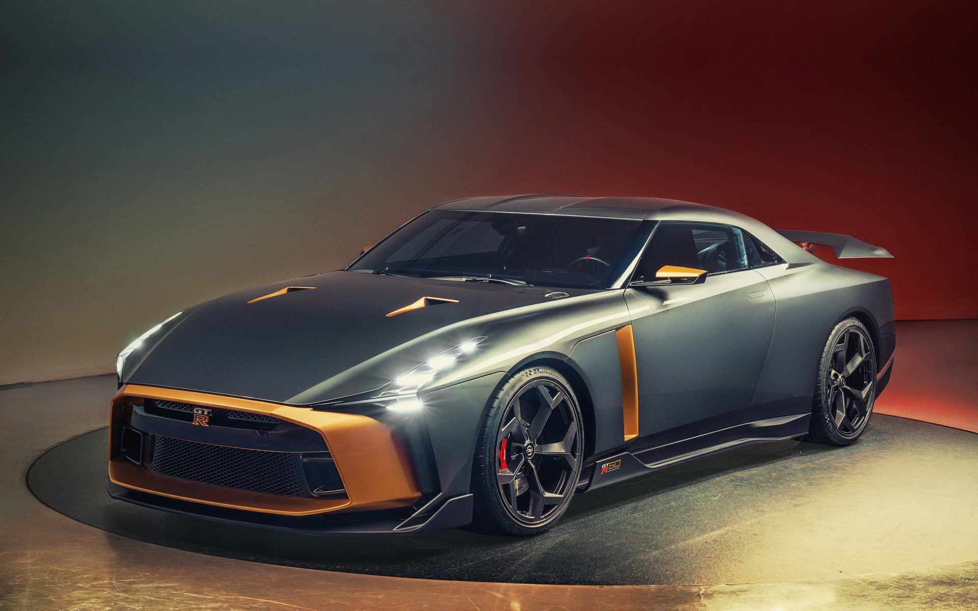 Description: A grey and orange sports car on display in a room with a red wall behind it and a red light behind it.