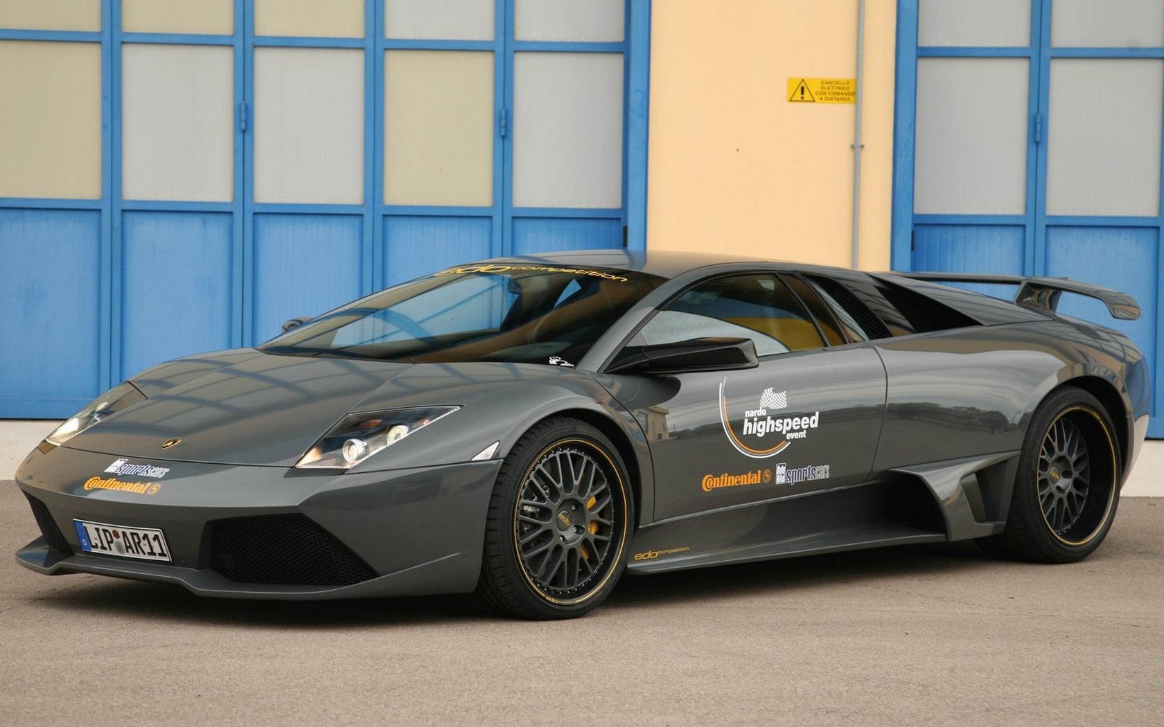 Description: A grey sports car parked in front of a building with blue doors and windows on the side of the building.