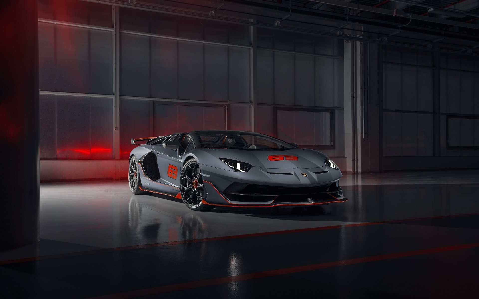 Description: A grey sports car parked in a garage with red lights on the side of it and a red light on the back.