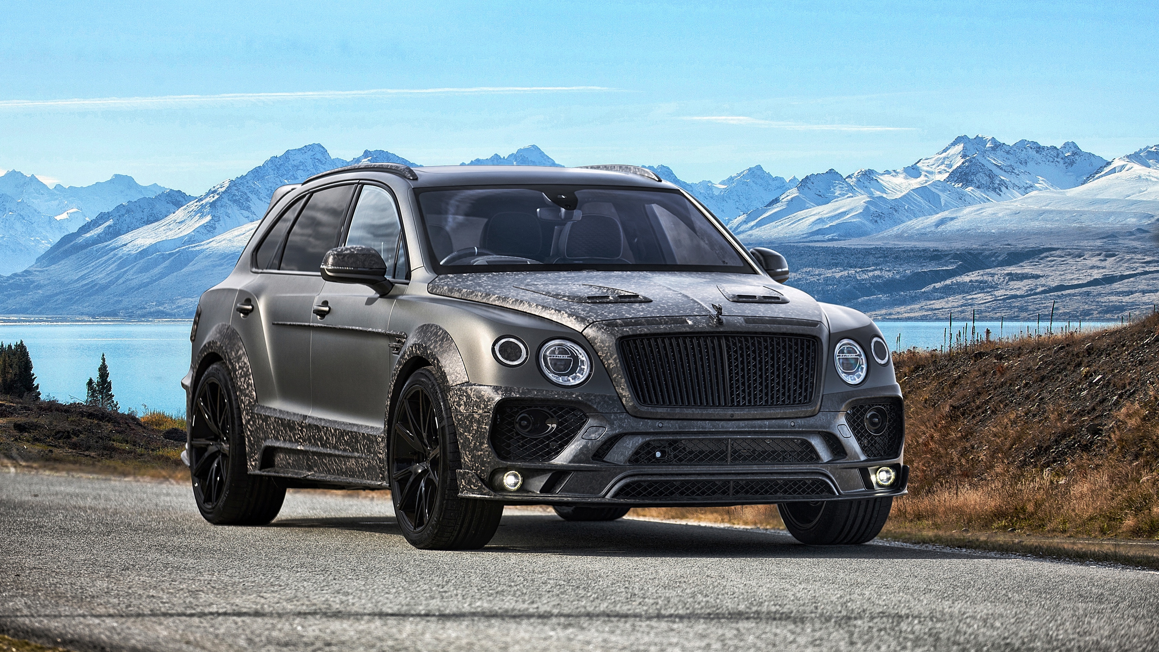 Description: A grey suv driving down a road next to a mountain range with a lake in the background and snow capped mountains in the distance.