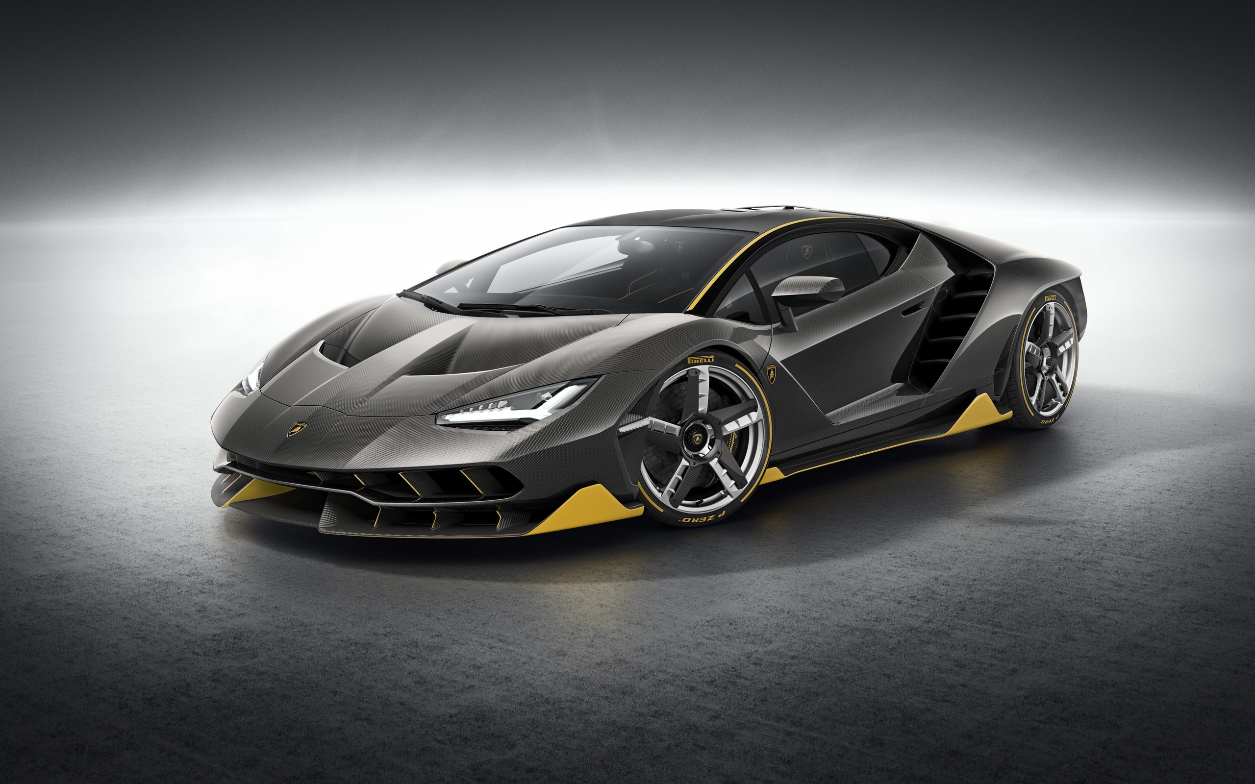 Description: A grey and yellow lamb car on a dark background with a spotlight behind it and a spotlight behind it.