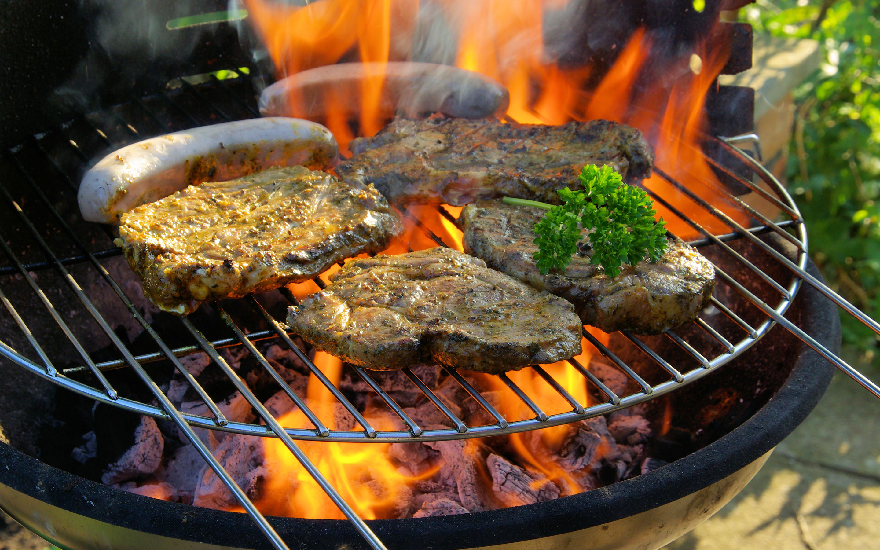 Description: A grill with hamburgers and steaks cooking on it's side and a green leafy garnish.