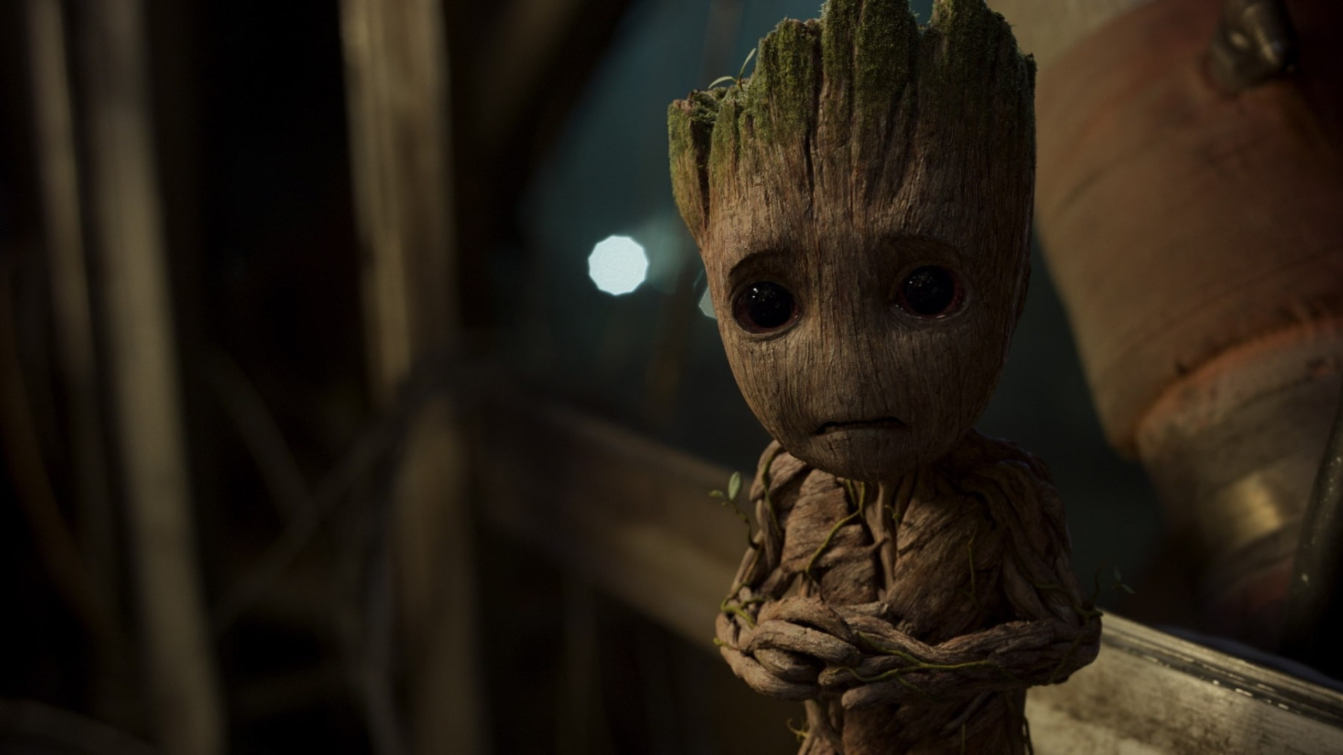 Description: A groote is standing in a room with a window and a plant in it's hands.