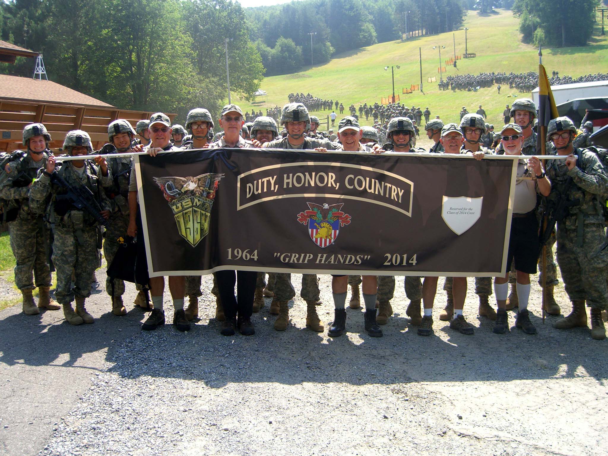 Description: A group of people holding a large banner in front of a building with a flag on it and a group of people in uniform.