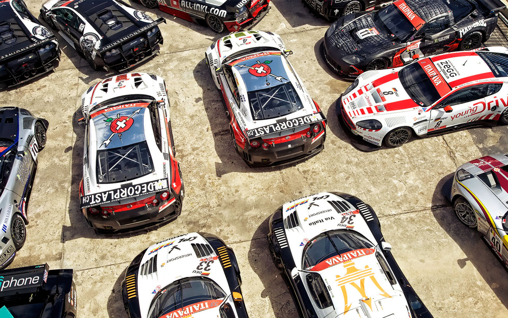 Description: A group of cars parked next to each other on a cement surface with a sky background and a few cars in the middle.